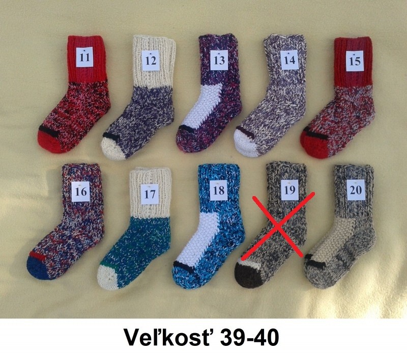Predám ručne pletené ponožky vlastnej výroby, vhodné aj ako darček. Veľkosti sú uvedené na obrázkoch, z každej farby je len jeden pár. Cena je 4€/pár. Objednávky telefonicky alebo cez SMS. Ďakujem