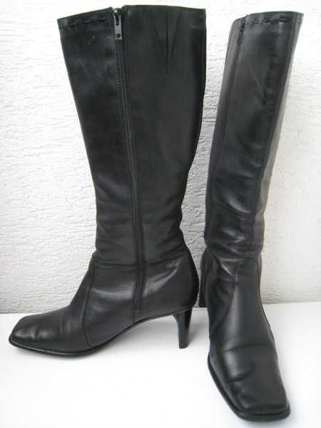 Predám dámske elegantné čierne kožené čižmy, veľ. 40, vyteplené, podpätok: 6cm, sára: šírka 35cm (v sáre aj gumička), výška 37cm, Čižmy sú zánovné, vo veľmi zachovalom stave.