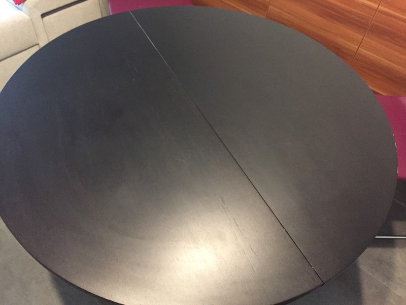 Stôl okrúhly - tmavohnedý, skoro čierny. Zn.IKEA - Bjursta. Priemer stola 115cm. Dá sa rozložiť do oválu dĺ.166cm. Výška stola 74 cm. Nohy trochu opotrebované - poobíjané najmä z vysávania, šikovný kutil si to vie zatrieť farbou. Jedálenský stôl s 1 výsuvnou doskou pre 4-6 osôb. Prídavná doska sa skladuje pod stolovou doskou. Skryté uzamykanie zabraňuje pohybu dosky a vzniku medzier. Pôvodná cena 199 Eur. Cena uvedená bez dopravy.