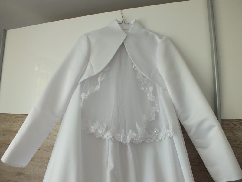 Ponúkam na predaj svadobné šaty, boli šité na mieru, oblečené iba raz, boli v čistiarni, nie sú vôbec poškodené. Šaty sú jednoduché, obvodom lemované krajkou, širšie ramienka, vrchný diel z čipky, pás saténový, opticky zoštíhľuje postavu, k šatám je spodnička aj bolerko. Viem poslať aj viac foto, ale najlepšie je vidieť naživo.