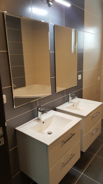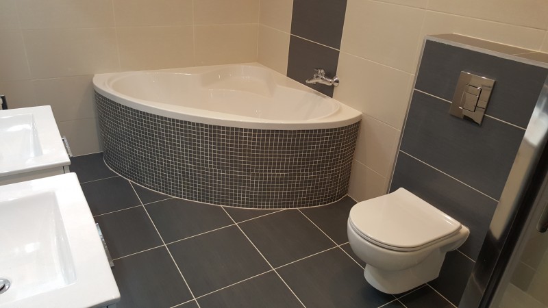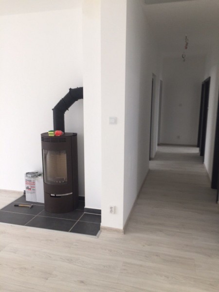 Interiér: cementové potery, sádrové omietky, sadrokartónové stropy, podlahové kúrenie, krb, všetky rozvody elektriny, vody, odpadu, podlahy, interiérová maľovka, obklady a dlažba v kúpeľni a WC, kompletná sanita, zárubne a interierove dvere.