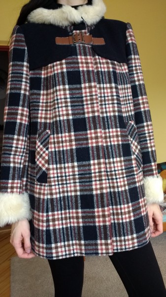 Krásny kabát, károvaný vzor, tmavomódrý odtieň, voľný strih - veľmi praktický, lichotí štíhlej aj plnoštíhlej postave, dokonca aj tehotným ženám, kožušinka na rukávoch a kapucni, veľkosť 14(cca 42),výborný stav, vyčistený v čistiarni