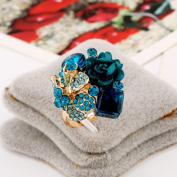 Párty prsteň s kryštálmi a ružou – modrý