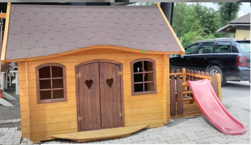 Predám detský domček z masívneho dreva, strecha lepenková, terasa so šmýkačkou, dvere kyvné dvojrkíídlové, 2x okienko. Domček je pre deti bezpečný, všetky hrany a plochy vybrúsené. Viac info ohľadom rozmerov telefonicky: 0948 696 947