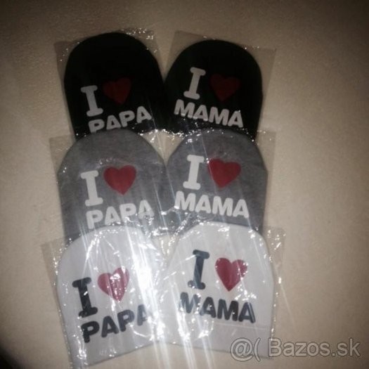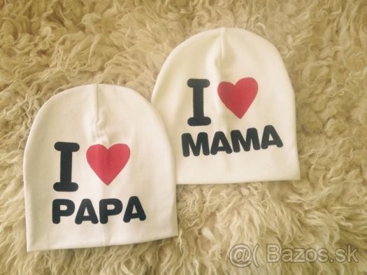nove v originalnom baleni čiapka I LOVE MAMA/PAPA pre dievčatko aj chlapčeka. Materiál: 97% bavlna, 3% lycra. Farba: biela,sivá,čierna velkost 0,5-4 roka cena 3 e