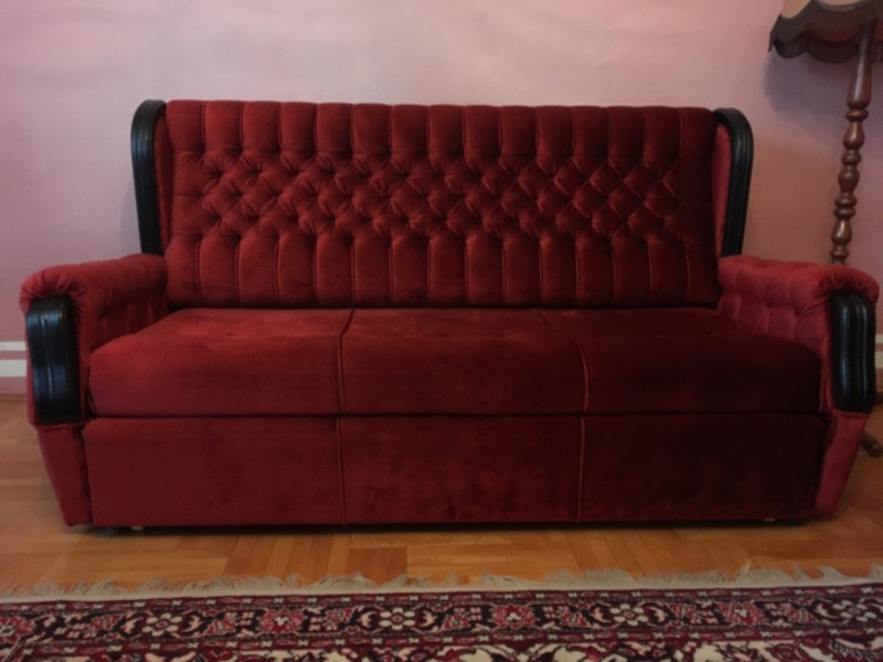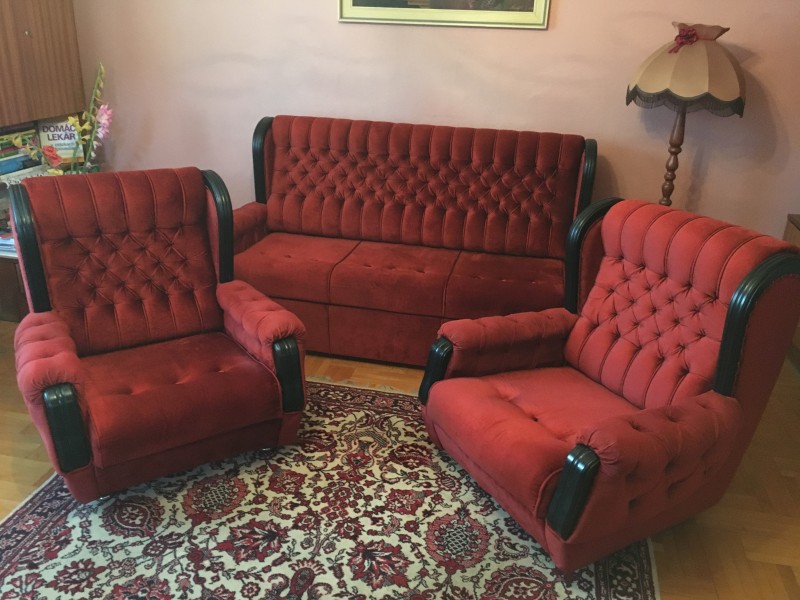 Predám zachovalú rozkladaciu sedačku a 2 kreslá (3+1+1) bordovej farby (poťahová látka plyš), 187x95cm, kreslá 90x95cm výška operadla cca 80 (60)cm. Cena cca 189 Eur