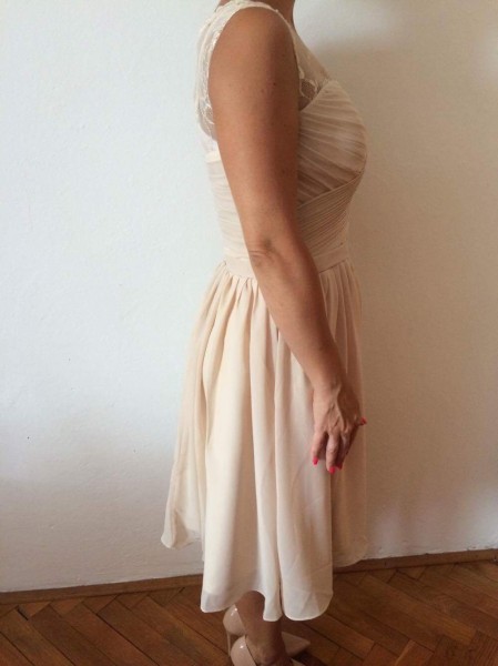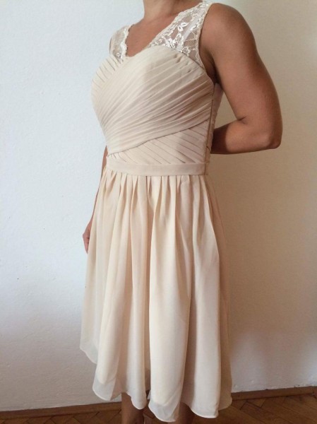Predam nove saty, nenosene - mne su dlhe a je ich skoda skratit. Farba bezova - champagne. Rozmery prsia 88 cm, pas 70 cm, boky 96 cm. Velkost 6 - EU36. Nepotrebujete pod saty ziadnu podprsenku, je to super urobene ako sucast siat. Na obrazkoch vidno bielu podprsenku ale tu som zabudla dat v tej rychlosti dole :-) postovne zadarmo !!!