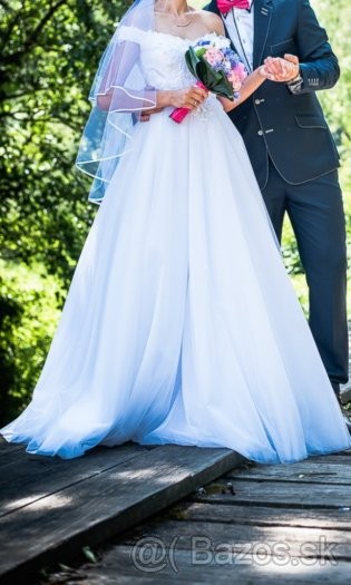 Predám Svadobné šaty s padnutými pevnými ramienkami, vzadu sú na viazanie takže sa dajú prispôsobiť, pevná časť na prsia(nie je potrebná ani podprsenka),vyčistené v čistiarni, snehovo bielej farby, dlhá sukňa po zem, zdobený vrch aj ramienka korálikmi. Veľkosť je XS(34) , no oblečie to aj kto má veľkosť S M(ako aj ja).