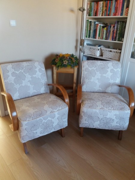 Predám dve kompletne zrenovované kreslá typu Halabala . Opravené sedadlá , nové čalúnenie s renováciou drevených častí. Predajné len spolu. Cena za obe kreslá spolu 600 eur.Dohoda možná.