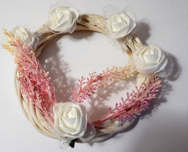 Venček na dvere na bielom prútenom podklade. Zdobený je po celom obvode textilnými, penovými a umelými kvetmi.