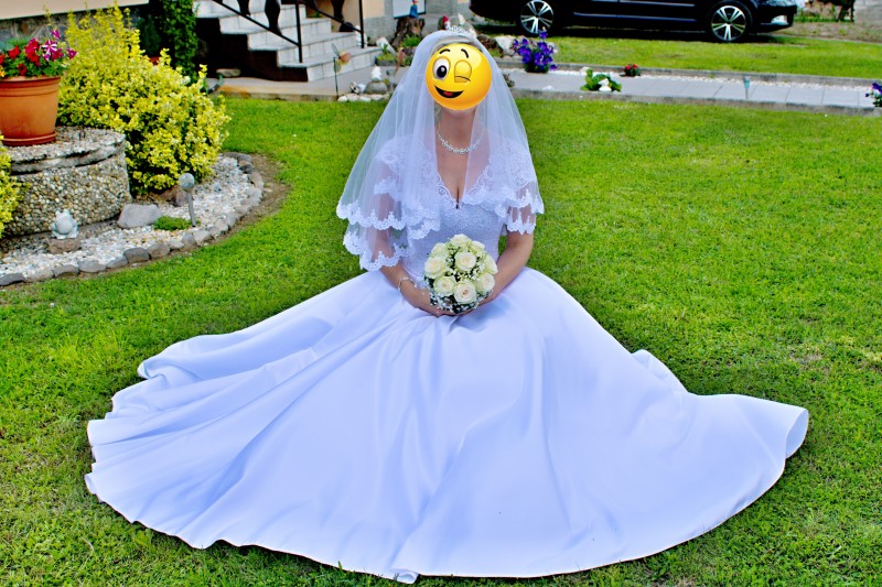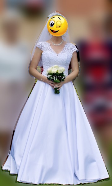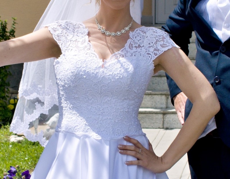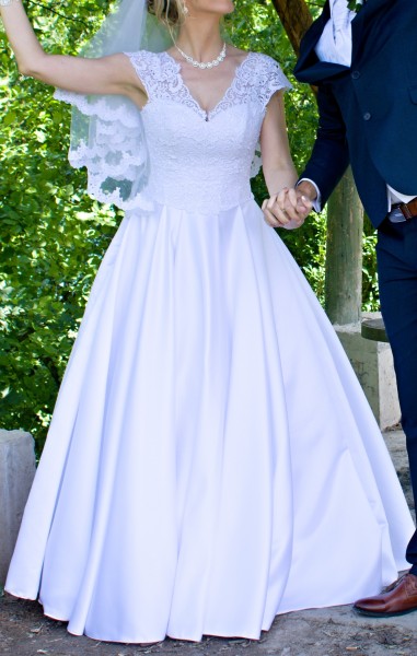 Predám svadobné šaty – veľkosť sadne na č. 38, 40, prip. 42. Možnosť vyskúšať v Bratislave - Dubravka. Su na vysku priblizne 170 cm, daju sa lahko skratit, farba biela. Korzet je vystuzeny a zdobi ho krasna čipka. Ramienka je mozne si upravit aj na uzke. Sukna je satenova. Vzadu su na zips a snurovanie, takze je mozne si saty prispôsobit aj na mensiu velkost. Pouzite iba raz, profesionalne vycistene, neposkodene. K satam ponukam aj cipkovany zavoj a kruh. Cena 350 eur.