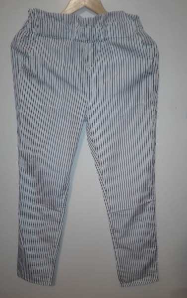 Predávam biele nohavice s tmavými jemnými pruhami. Sú z ľahkého materiálu, vhodné na leto, s opaskom. Veľkosť je M ale sedia skôr na postavu S.