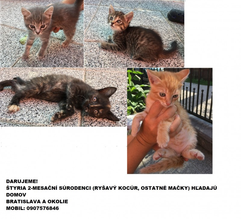 Darujem 3 mačky a jedného kocúra (rysavy, na 1. foto) narodené cca pred 2 mesiacmi. Mačiatka sú zdravé a socializované. Bratislava a okolie. 0907 576846