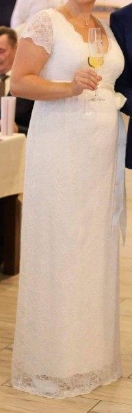 Predám tehotenské svadobné šaty značky Tiffany Rose vo farbe ivory, objednané z UK, veľkosť 3, európska veľkosť 40-42. Na fotkách tehotenské bruško v 6. mesiaci, stále dosť miesta aj pre vyššie štádium tehotenstva. Šaty sú elastické, čipka im dodáva nádych luxusu. Reálne foto, moja výška 167, obuté biele lodičky s výškou podpätku cca 7 cm. Šaty sú chemické vyčistené, v 100% stave, som prvá majiteľka. Cena šiat 150€ vrátane poštovného. Saténová stuha grátis. V prípade záujmu pribalím grátis aj bielu „kabelku“, biele lodičky značky Graceland Deichman veľkosť 39, jedenkrát obuté, bez poškodenia, cena 15€ – viď foto.