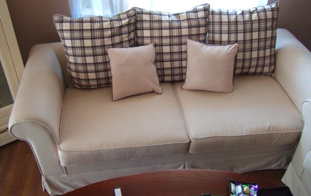 Veľká, pohodlná,sedacia súprava 2+3 s 7-mi vankúšmi, farba capuccino-biela káva, ako nová, takmer nepoužívaná, pôvodná cena 750 eur, rozmery 215x90cm, 165x90cm, cena spolu 290 alebo osve /120+170/eur