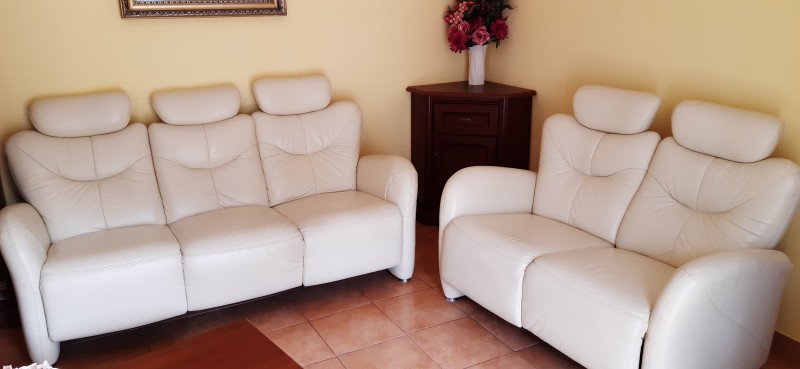 Predám lacno luxusnú a krásnu celokoženú sedaciu súpravu. V kvalitnom stave, veľmi zachovalá, bez poškodení, Nemeckej výroby z kvalitnej a pravej kože. Celá sedacia súprava má vyklápací mechanizmus (ktorý sa dá uviezť do polosedu aj ľahu) ideálny pre zrelaxovanie. Každoročne je ošetrovaná včelím voskom. Pôvodná cena bola 2000€.