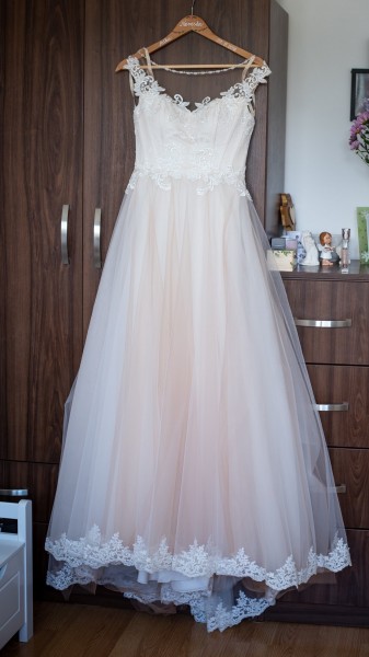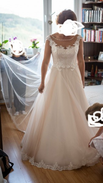 Ponúkam svadobné šaty s čipkovaným živôtikom, s nadýchanou tylovou sukňou,s krásnym čipkovaným lemom vo farbe ivory- capucino šité na mieru v svadobnom salóne. Šaty sú oblečené len raz na mojej svadbe a profesionálne vyčistené. Sedia na veľkosť menšia 38 prípadne aj 36 ( obvod cez prsia 90cm, pás 74 a boky 97 cm) výška 161+ cca 8cm opätok. Šaty sadnú len na uvedené rozmery a menšie, kedže sú ušité na mieru v svadobnom salóne a zapínajú sa na zips. Zúžiť sa dajú vďaka šnurovačke. Šaty sú vystužené, majú vsadenú podprsenku. Majú dlhé tri vlečky, ktoré sa dajú samostatne vypnúť. Šaty jemožné osobne si vyskúšať v PB.V prípade záujmu poskytnem viac informácii o cene a stave šiat.