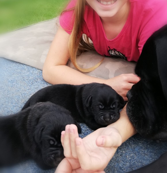 Dňa 30.08.2019 sa narodili čistokrvné šteniatka Cane Corso, 5 feniek a 2 psy. Tieto psy milujú deti, vhodné do rodiny s detičkami. Obidvaja rodičia sú zdraví, čistokrvní. Fenka je čiernej farby a pes je modrej farby (na fotkách sú aj rodičia) . Odber šteniatok je od 30.10.2019, kedy budú mať osem týždňov. Šteniatka sú ošetrené zverolekárom, sú postupne viackrát očkované, odčervené, so zdravotným preukazom a na žiadosť čipované. Šteniatka môžete pozrieť v šiestich týždňoch, alebo si ich rezervovať. Aktuálne fotky Vám pošleme na vašu žiadosť. Viac informácií vám poskytnem na tel. čísle (po 16:00 hod.).