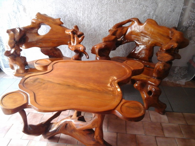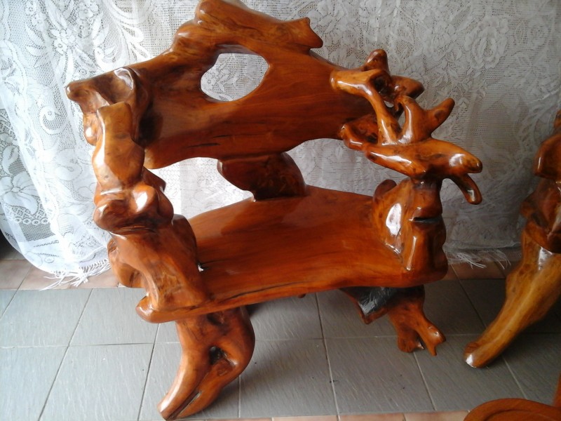 Predám nádhernú nábytkovú súpravu 2x fotel 1 x servírovací stolík z masívu samorastov koreňa teakového dreva, povrch brúsený ošetrený lakom, dovoz z Thajska, vhodný do haly, na terasu, poľovnícku chatu a pod.
