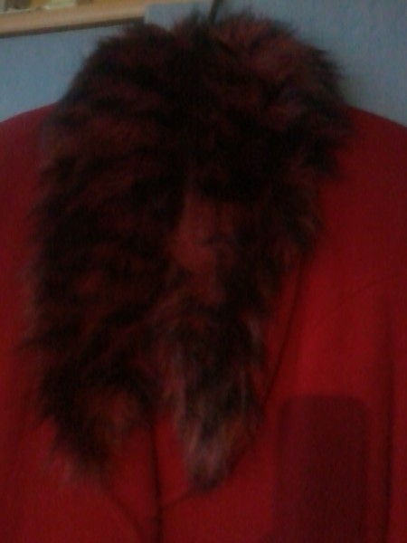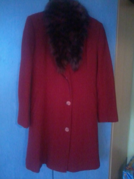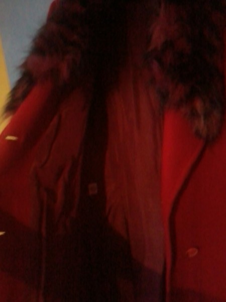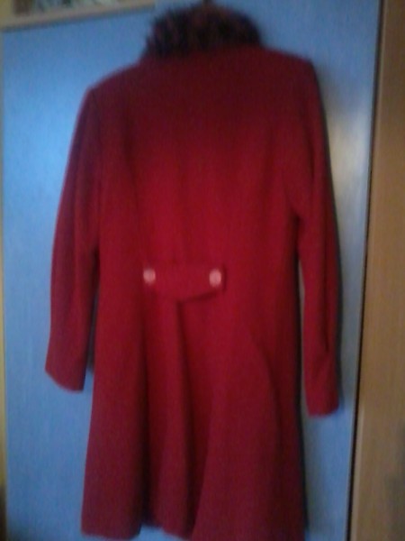 Predám nosený červený kabát. Pôvodne bol dlhý, ale dala som si ho skrátiť. Rozmery sú: plecia - 41cm, rukáv - 60cm, dĺžka - 90cm. Kožušinka na golieri je napevno, nedá sa odopnúť. Cena je bez poštovného.