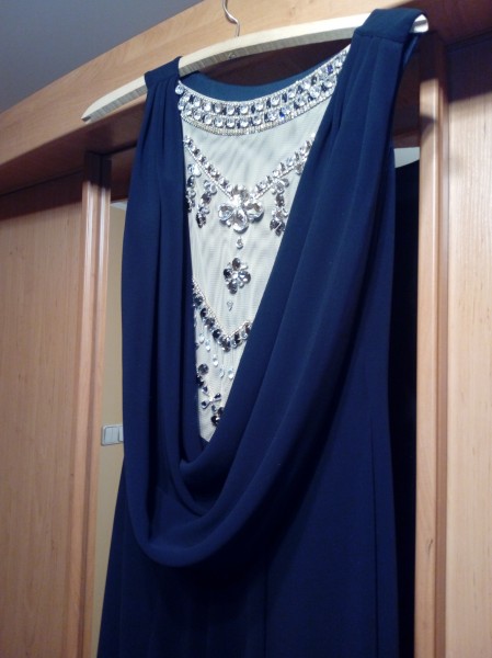 Predám tmavomodré spoločenské šaty s kamienkovou aplikáciou na chrbte. Veľkosť 42(nosím č.38).