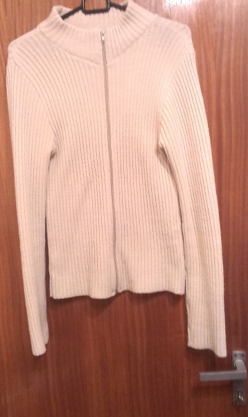 Predám nosený svetlučkobéžový svetrík na zips. Má jemné žmolky z nosenia, ale dá sa ešte donosiť. Rozmery: plecia- 42cm, rukáv - 68cm, dĺžka - 62cm. Cena je bez poštovného.