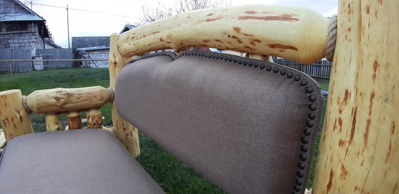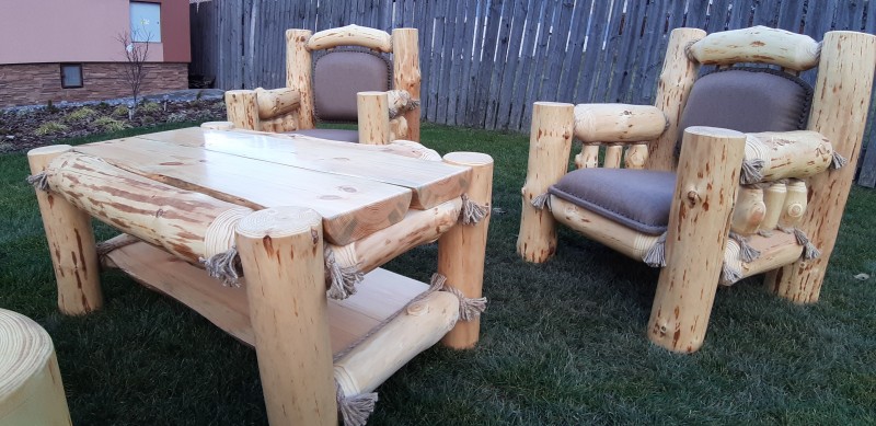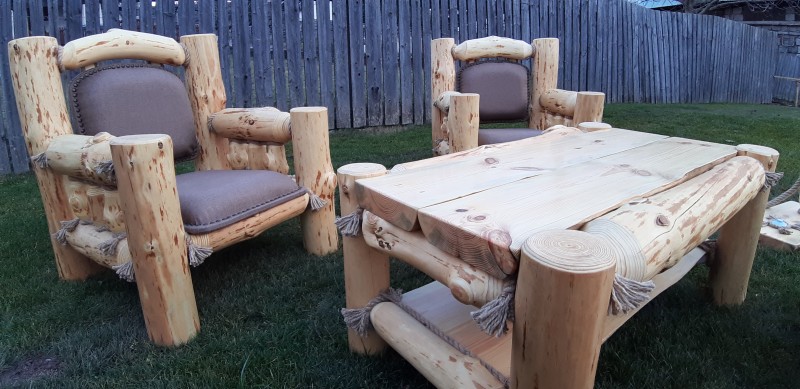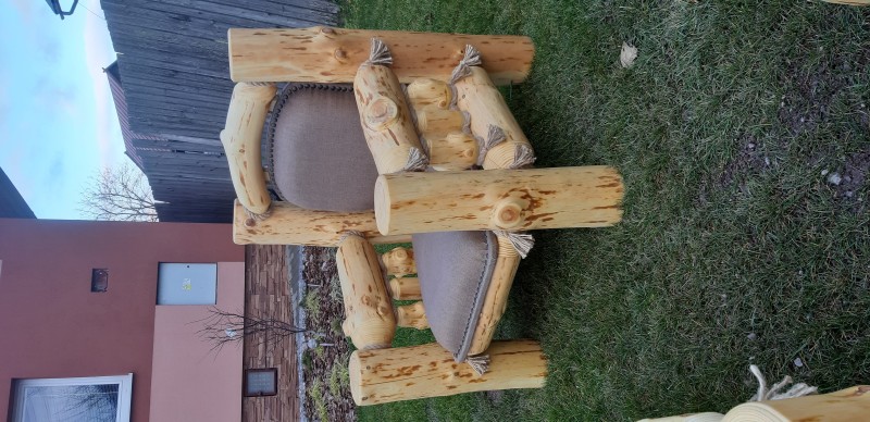 Predám originálnu ručne robenú sedaciu súpravu z borovicovej guľatiny vhodnú na chaty, chalupy, nevhodná do exteriéru.