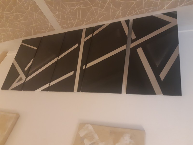Predam moderny abstraktny obraz, original, rucna malba, 5 dielny, moznost zavesit aj jednotlivo, ako 5 obrazov, cierno-strieborny, s 200cm/v 80cm.