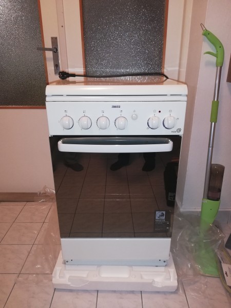 Starší sporák kombinovaný vrch plyn spodok elektrický.