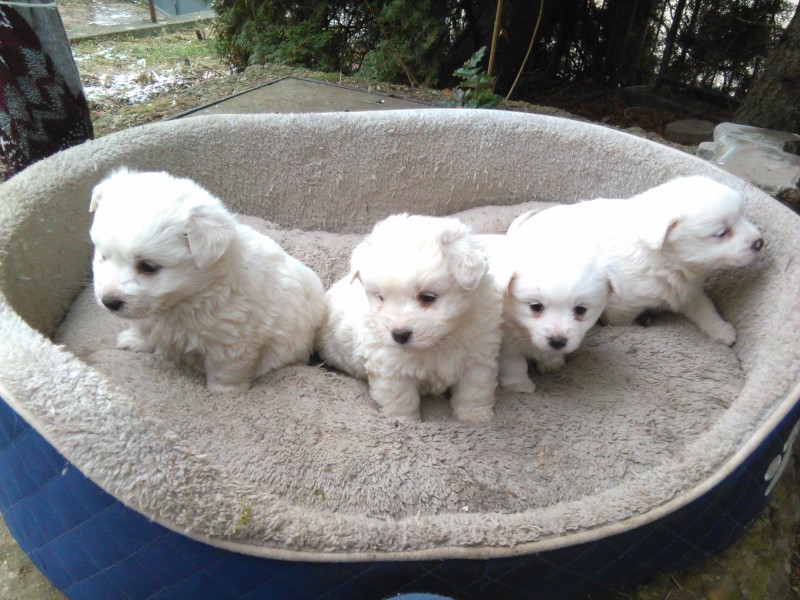 Predám krásne šteniatka maltezákov - 3 psíkov a 1 fenku, majú 4 týždne, odber možný ihneď. Sú hravé, veľmi pekné a už samé papajú. Okres Levice, tel. kontakt 0903 834 348. Cena 120 eur za kus.
