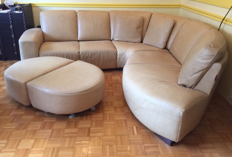 Ponúkam koženú rohovú sedačku béžovej farby s 2 taburetkami a s 2 vankúšmi vo výbornom stave.