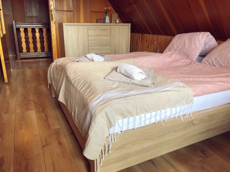 Na poschodí sú situované dve 2-lôžkové spálne s manželskou posteľou a spoločným balkónom pre dokonalý výhľad. Ďalej sa tu nachádza 4-lôžková spálňa s dvoma manželskými posteľami.