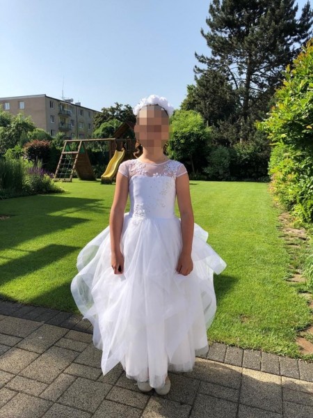 Predám 2x použité nádherné šaty na 1. sväté prijímanie, bohatá sukňa, bez spodničky, vzadu šnúrovačka + gombík pri krku, krásne zdobenie živôtika, bez chýb, po použití vyčistené v čistiarni. K dispozícii aj slušivé biele saténové bolerko s 3/4 rukávom (10 Eur). V prípade záujmu pošlem rozmery aj detailnejšie foto.