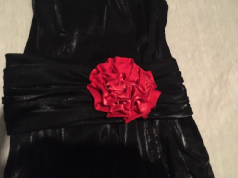 Predám čierne šaty veľ.36 z lesklého materiálu s odnímateľným opaskom s červeným kvetom bez ramienok, dĺžka 83cm,pás 62cm, elastické, vo vrchnej časti okostice z vnútornej strany, 2x oblečené, cena 10€ + poštovné
