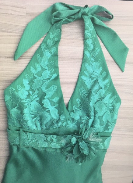 Predám zelené spoločenské šaty(stužková,ples,venček),veľ.32-34 na výšku cca 164cm ,krásna zelená farba, viažu sa okolo krku, holý chrbát, naboku zips,opasok pod prsiami s odnímateľnou kvetinou dĺžka 152cm, pás cca 54cm, boli zužované od pása hore krajčírkou, takže na chudú postavu, na sukni je jemnučko zachytená látka voľným okom nevyditeľné,3x oblečené, pôvodná cena 200€ teraz 40€ + poštovné