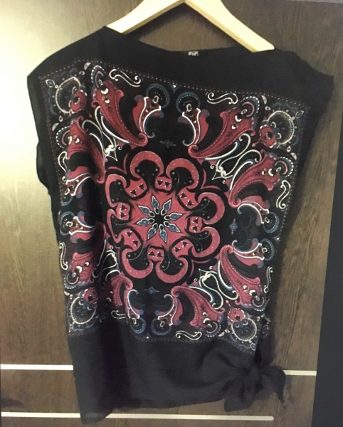 Predám čierne tričko s farebnou potlačou veľ.36, oversize, dĺžka 63cm,šírka 57cm, dole na uviazanie,1 x oblečené, cena 5€ + poštovné