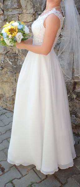 Šaty sú vo farbe ivory. Majú košíčky (cca B), takže podprsenka nie je nutná :). Šaty sú podšité jednoduchou spodničkou (po celej dĺžke sukne).