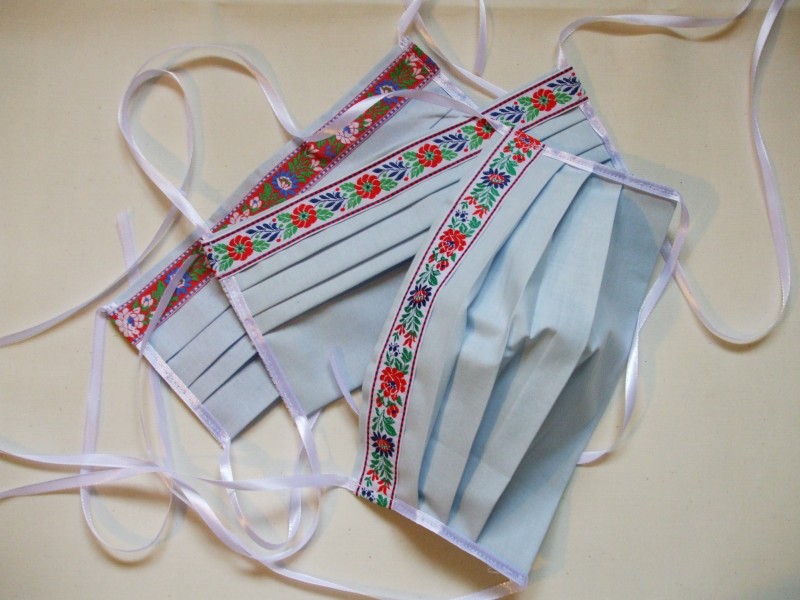 Dvojvrstvové rúško kapsičkové s otvorom na vloženie vymeniteľnej filtračnej vložky, všitý ohybný pásik pre tvarovanie okolo nosa, materiál - 100%-ná bavlna zdobená folklórnou stuhou. Rúška je možné opakovane prať, vyvárať, sterilizovať. Uväzovanie na šnúrky.