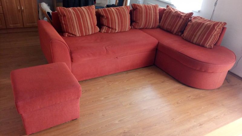 Predám lacno rohovú sedaciu súpravu tehlovej farby s taburetom a vankúšmi. Rozmery: 225x173 cm. Je rozkladacia, opotrebovaná na jednom mieste - viď foto. Inak zachovalá, pohodlná, minulý rok tepovaná. Cena dohodou.