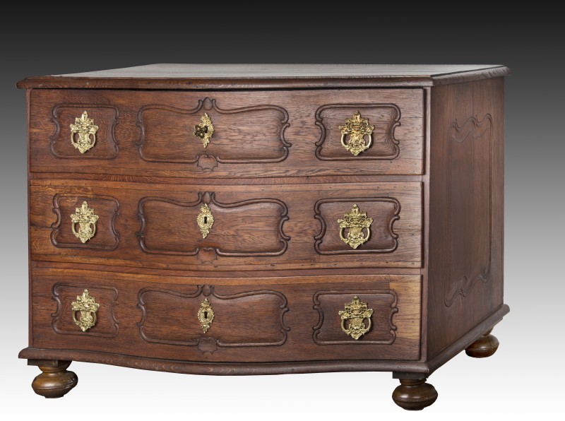 Baroková komoda vyrezávaná (knochenbarok), dub masív. Pôvodné kovanie a zámky. Veľká: 126 x 76 x 90.