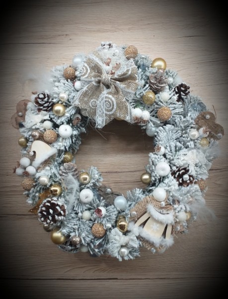 Vianočný zasnežený ihličnatý veniec na zavesenie .