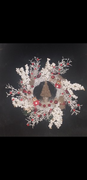 Závesný vianočný veniec s vetvičkami v bielej farby, dekorovaný zlatým stromcekom ,červenými sobíkmi,červenými a zlatými guličkami a vela inych dekoracii