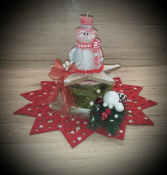 Obsahuje podložku, drevenú hviezdu, sviečku snehuliaka a iné dekorácie