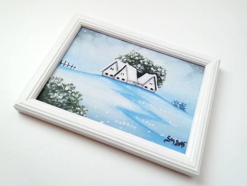 Obrazok je namalovany olejovymi farbami na drevenom podklade. Vlozeny je do dreveneho ramu. Ram je prefarbeny bielou akrylatovou farbou.