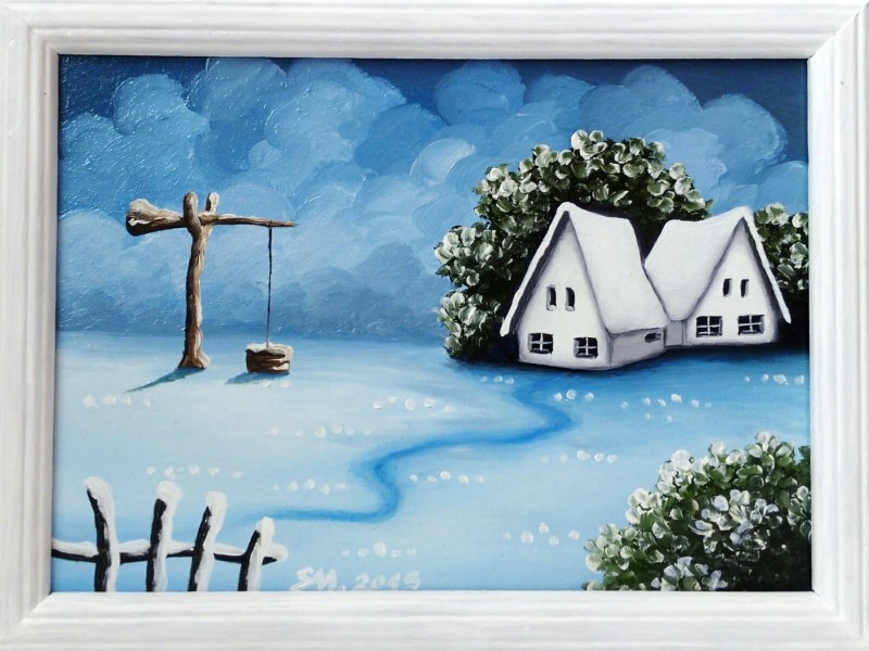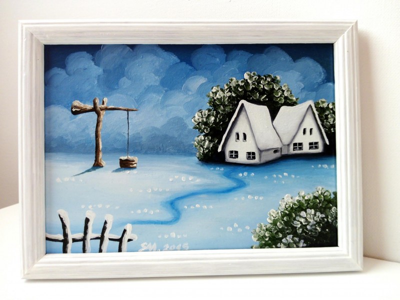 Obrazok je malovany olejovymi farbamy na drevenom podklade,vlozeny do dreveneho ramu. Ram je prefarbeny bielou akrylatovou farbou.