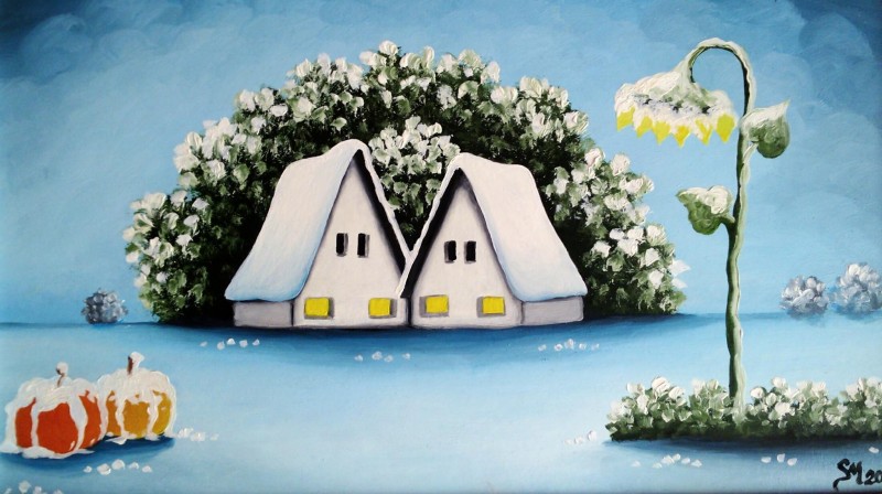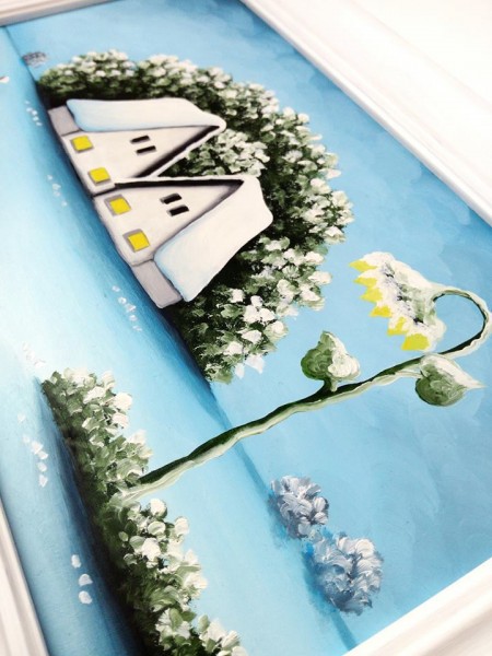 Obrazok je malovany olejovymi farbami na tvrdom kartone. Zaramovany je do dreveneho ramu. Ram je prefarbeny akrylatovou bielou farbou.
