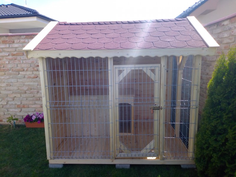 1,8m x 2m - vo voliere je zateplena buda podla velkosti psa, vyška v štíte 2m, na boku 1,5m - cena 540,-eur