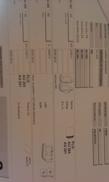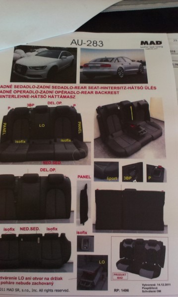 Predám nové autopoťahy originál na vozidlo Audi A6 sedan od r.v. 2011 -. Material koža alcantara v strede čierna, pod nohami a pod hlav.opierkou alcantara sivá, okraj koža čierna,okrasný šev strieborný. Originál zabalené priamo od výrobcu MAD. V prípade nejakých otázok rád odpoviem telef. - rýchlejšia forma komunikácie. Možnosť osobného doručenia./v závislosti od lokality na Slovensku/.