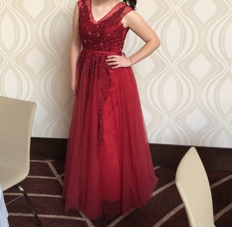 Dlhé tmavočervené spoločenské šaty na akúkoľvek príležitosť. Veľkosť je približne M ale šaty sú univerzálne a prispôsobiteľné keďže majú zapínanie na viazanie zozadu. Raz nosené, pôvodná cena 450eur.