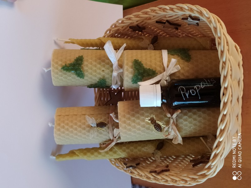 1.balíček - sviečky v tvare ihlan, úľ, kocka, macko, anjel, stredná točená sviečka, tenká točená sviečka, propolisová tinktúra, orechy v mede veľké, peľ v mede malý = 30€